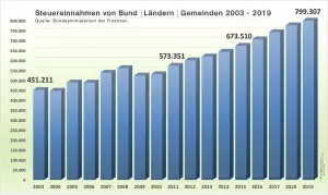 So sind die Steuereinnahmen von Bund, Ländern und Gemeinden von 451 Milliarden Euro im Jahre 2003 auf 799 Milliarden Euro im Jahre 2019 gestiegen.